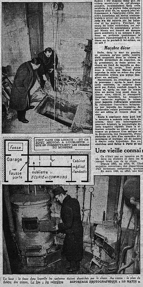 Le 11 mars 1944, les pompiers sont alertés par des voisins incommodés, depuis plusieurs jours, par des odeurs pestilentielles provenant d'une cheminée de la maison située 21, rue Le Sueur. Personne, ils fracturent une fenêtre et pénètrent dans l'immeuble. Ils sont vite alertés par les émanations et le ronflement d'une chaudière. Descendus dans la cave, ils découvrent sur le sol des corps humains dépecés, dont certains brûlent dans une des deux chaudières à bois d'où provient la fumée. Et aussi la police découvre au fond de la cour, des dizaines de cadavres rongés par la chaux vive dans l'ancienne fosse septique.